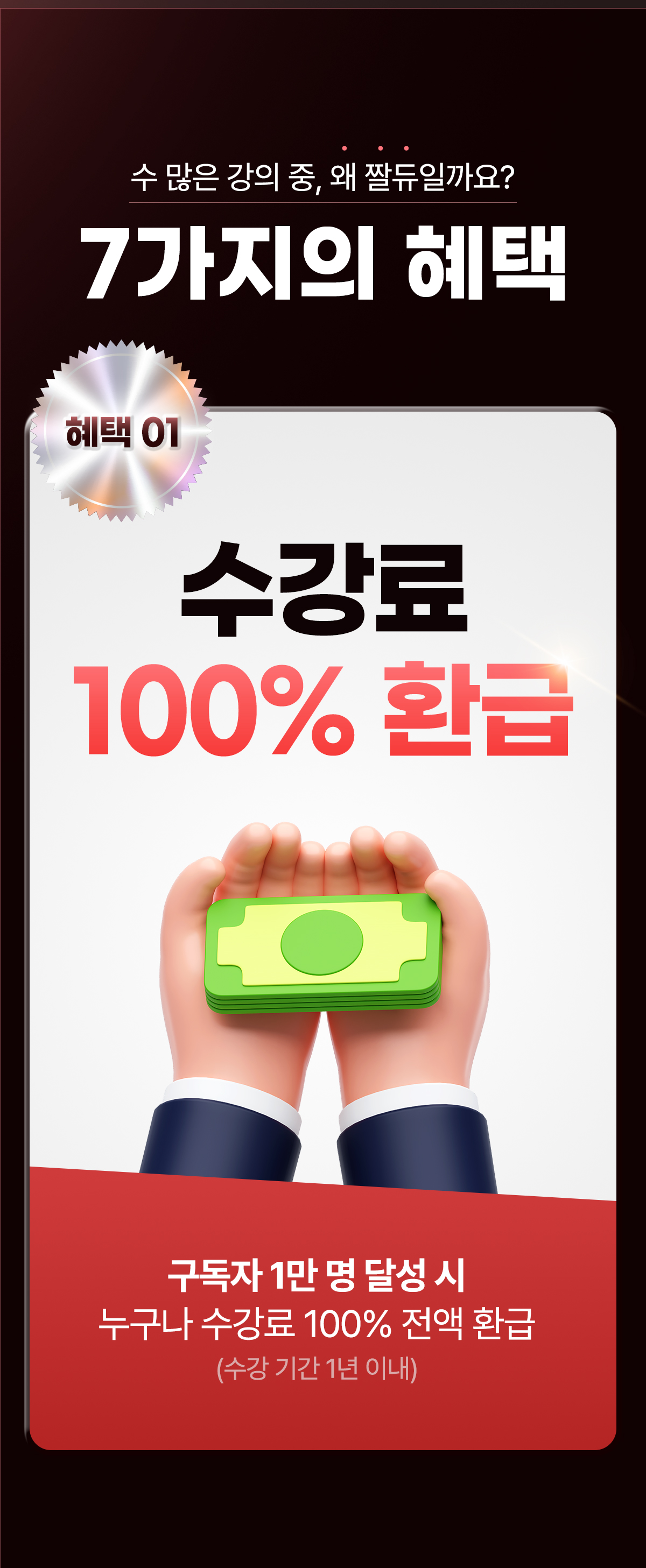 6. 위 조건 달성 후 "짤듀" 100% 환급과정" 후기를 지정한 게시판에 남겨 주세요. (게시판 생성예정) (예: 구독자 1만명 까지 오는 나의 노력 그리고 다른 수강생분들에게 전하고 싶은 말)